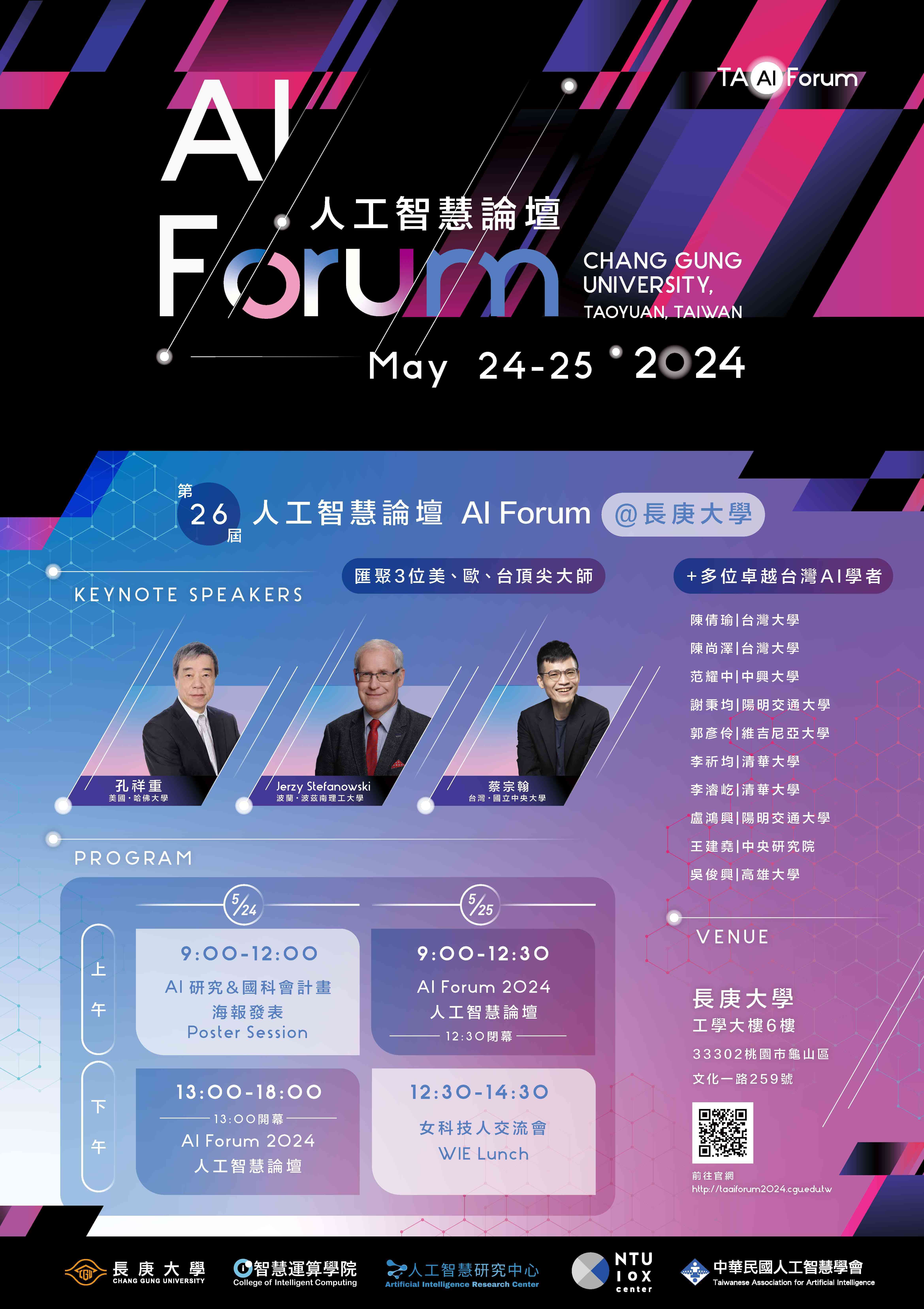 第26屆人工智慧論壇將於5/24(五)至5/25(六) 由長庚大學智慧運算學院、人工智慧研究中心、臺大智慧聯網創新研究中心以及中華民國人工智慧學會共同主辦。此次盛會很榮幸邀請到三位國內外知名學者,美國哈佛大學比爾蓋茲講座教授暨中研院院士孔祥重教授、波蘭科學院院士Jerzy Stefanowski教授與國立中央大學蔡宗翰教授擔任 Keynote Speakers。